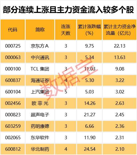 值得注意的是,686只连续上涨个股中,27只个股期间主力资金累计净流入超过亿元。其中,累计资金流入最多的为京东方A,主力资金累计流入22.13亿元。