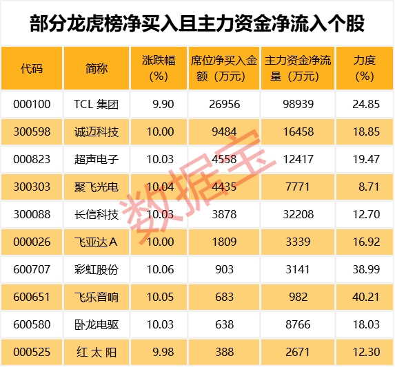 从盘口资金流向来看,主力资金净流入超千万且龙虎榜净买入个股共有9只,其中TCL集团、长信科技、诚迈科技等个股资金净流入金额最大。净流入力度最大的个股有飞乐音响、彩虹股份、TCL集团,净流入力度分别为40.21%、38.99%、24.85%。