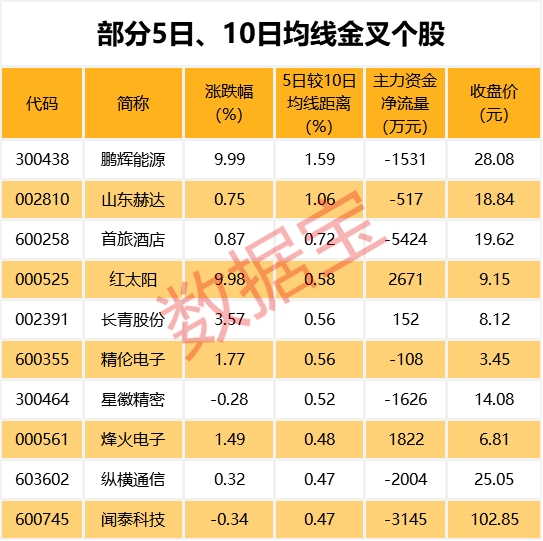 最新数据显示,两市有65只A股的5日均线主动上穿10日均线,其中鹏辉能源、山东赫达、首旅酒店等个股的5日均线较10日均线距离最大,分别达1.59%、1.06%、0.73%。