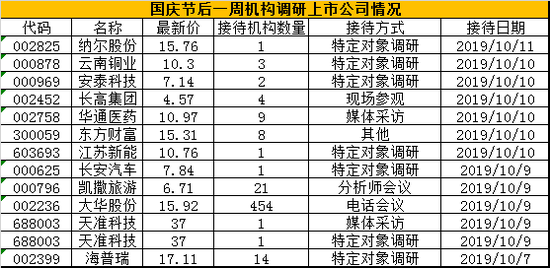 10月12日,国庆节后,截止发稿choice数据显示,12家上市公司接受机构调研,其中大华股份接受了454家机构调研,凯撒旅游、海普瑞分别受到21家、14家机构调研;华通药业主要为媒体采访,东方财富(15.310,0.25, 1.66%)也受到较多机构关注。详情如下: