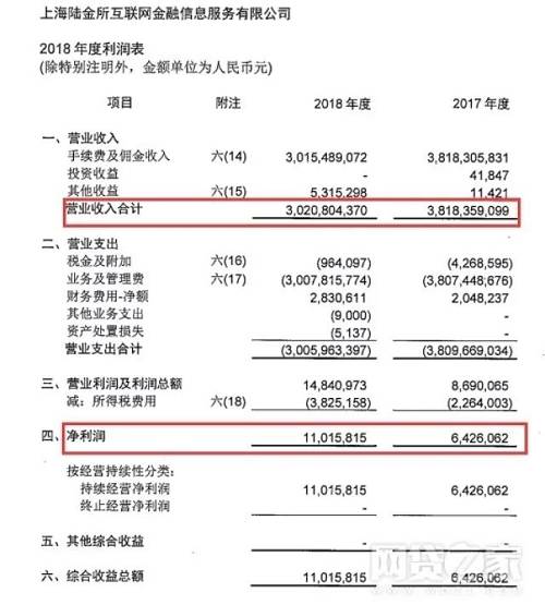财报显示,陆金服2018年全年营收为30.21亿元(其中手续费及佣金收入为30.15亿元),同比2017年的38.18亿元下降20.89%;2018年全年净利润为1101.58万元,同比2017年的642.61万元增长71.42%。