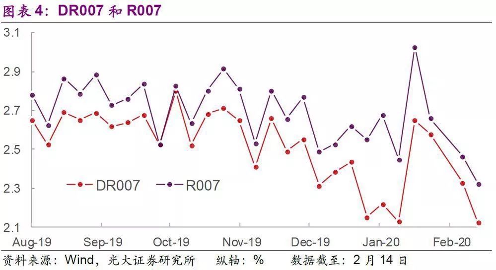 二是由于逆回购期限较短,节后两周央行投放的流动性基本都已自动到期回笼,目前只有2月10日投放的2000亿14天期逆回购尚未到期。此外,本周一央行除新作2000亿MLF(中期借贷便利)外,还投放了1000亿7天期逆回购。