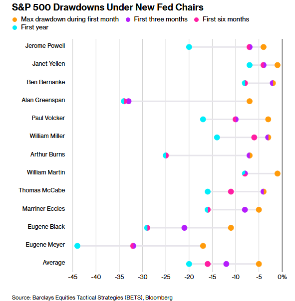 巴克莱银行全球股票战术策略主管Alexander Altmann整理的数据表明,自1930年以来,在美联储新主席上任后的一、三、六个月内,标普500指数平均的最大回撤幅度分别为5%、12%和16%。此类回撤幅度均超过了标普500指数在任意随机选取年度内典型峰谷间的跌幅。