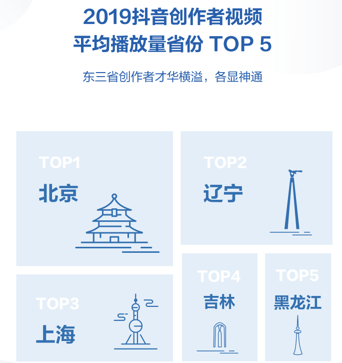在创作者视频平均播放量排行榜上,北京位居起售,黑龙江、吉林、辽宁均上榜前5名。