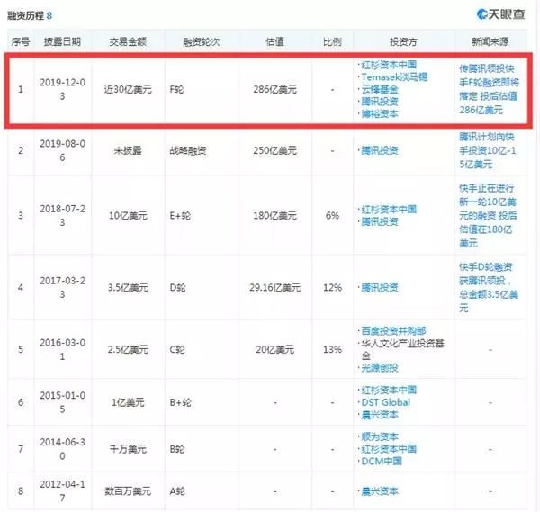 而资本的十分看好短视频行业的发展。在冲击3亿日活的快手,估值已经高达2000亿元。12月,快手被爆出即将完成新一轮融资,总金额达到30亿美元,这极有可能是快手上市前最后一轮融资,投后估值达到286亿美元(约合人民币2014亿元)。此轮融资为腾讯领投,出资20亿美元;博裕资本、云锋基金、淡马锡、红杉跟投。