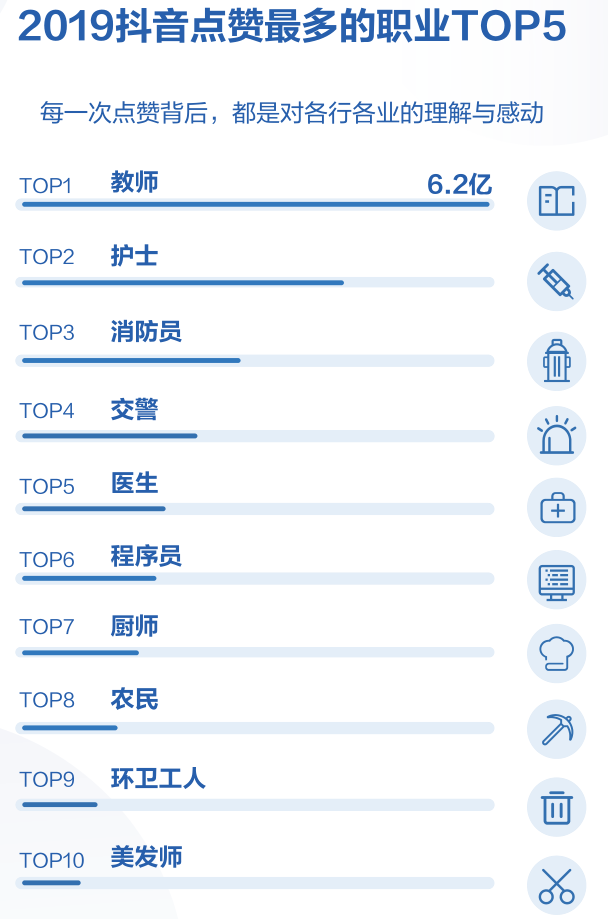 各行各业的人都在抖音上展现自己,其中,教师这一职业被点赞6.2亿次。其次有护士、消防员、交警、医生、程序员等等。
