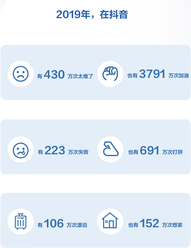 而在抖音,人们也在记录自己的泪水与欢笑,全年抖音上有430万次“太难了”,也有3791万次加油;有223万次失败,但也有691万次打拼。有106万次漂泊,也有152万次想家。