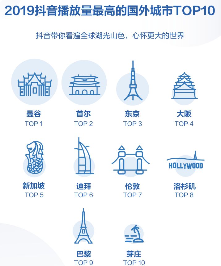 抖音已经渗透进人们生活的方方面面。2019年,抖音用户全球打卡6.6亿次,足迹遍及全世界233个国家和地区,最受欢迎的国外城市是曼谷、首尔和东京,被点赞最多的国内城市是北京、成都和上海。