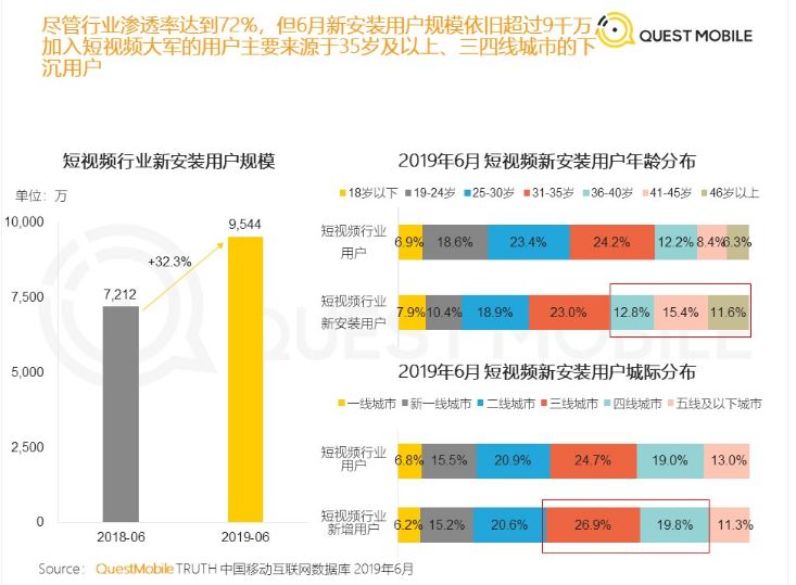 questmobile2019年年中数据,短视频行业的渗透率达到72%,但新安装客户规模仍超过9000万,其中主要客户源于35岁以上、三四线城市的下沉用户。