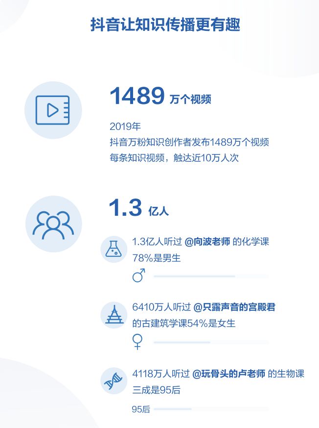 抖音也成为了大家学习的一个重要场所。2019年,抖音万粉知识创作者发布1489万个视频,其中有1.3亿用户听过@向波老师的化学课。