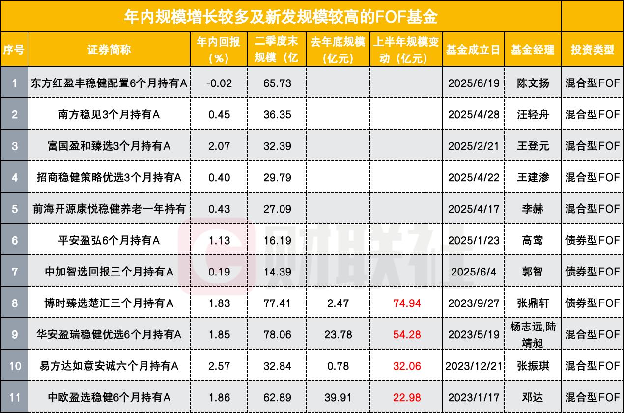 其中,博时臻选楚汇三个月持有为上半年规模增长最快的FOF基金,产品规模从2.47亿元的小体量成功增至77.41亿元,增量达74.94亿元;华安盈瑞稳健优选6个月持有也从23.78亿元增至78.06亿元,上半年增量为54.28亿元。同期,易方达如意安诚六个月持有规模从0.78亿元增至32.84亿元,增量达32.06亿元;中欧盈选稳健6个月持有规模从去年底的39.91亿元增至62.89亿元,上半年增量达22.98亿元。
