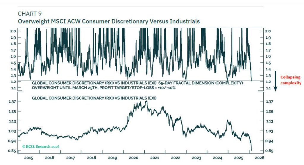 在此宏观背景下,股票资产有望继续领先于债券。BCA Research建议战术性超配MSCI全球可选消费板块,相对工业板块。该板块过去65个交易日已大幅跑输近20%,存在显著的修复空间。