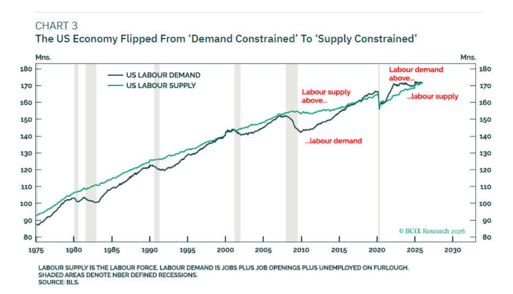美联储的货币政策框架可能迎来重大转向。BCA Research分析师Dhaval Joshi预测,在未来美联储主席沃什的领导下,美联储或将事实上容忍通胀率升至2.5%至3.5%区间,以支撑美国经济在更高温度下运行。这一策略的核心动因在于美国劳动力市场已进入罕见的供需平衡点,任何一方的收缩都可能导致经济衰退。