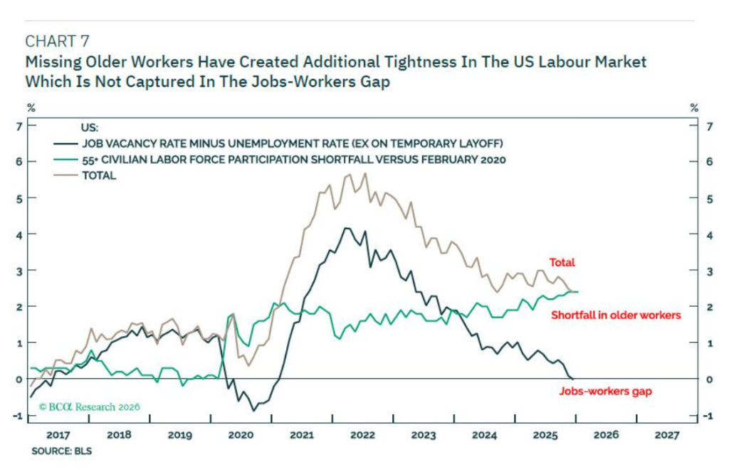 工资通胀结构性走高的深层原因,在于劳动力人口构成的持久性变化。相较于疫情前,美国劳动力供给减少了近300万年长工人。由于不同年龄段在劳动力市场上存在明显的功能互补性,年长工人难以从事体力密集型岗位,年轻工人亦无法替代需数十年经验积累的专业角色,年长工人的缺位在总体岗位缺口之外,创造了额外的结构性紧张。模型显示,将这一结构性因素纳入考量后,可以近乎完美地解释美国工资通胀的演变轨迹。