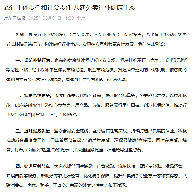 一、规范补贴行为。京东外卖将继续坚持反内卷立场,坚决杜绝不正当竞争,抵制“0元购”等恶性补贴,绝不以冲单量体现市场地位、制造市场泡沫。搭建简单透明的补贴机制,依法向商家和消费者公示营销活动信息,商家可自主经营和参与促销活动。