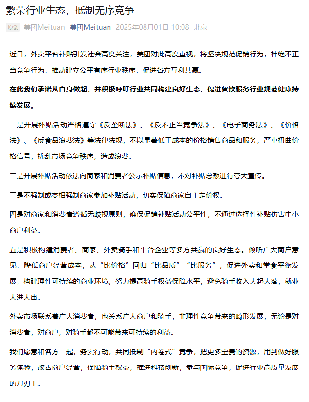 美团:繁荣行业生态,抵制无序竞争