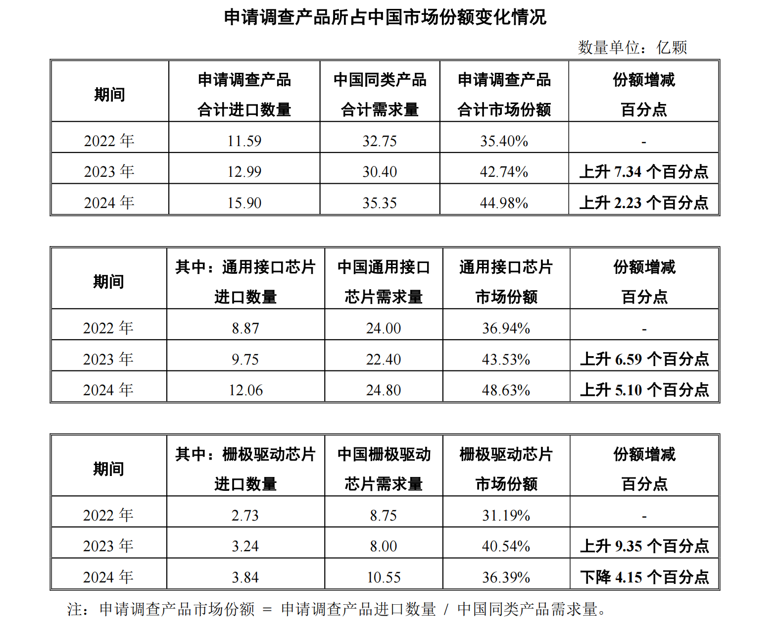 在2022到2024年期间,美国相关模拟芯片对华进口量呈现 “持续大幅增长” 态势,从绝对数量来看,申请调查产品占中国同类产品总进口量的比例呈逐年上升趋势,三年进口量分别为11.59亿颗、12.99亿颗、15.90亿颗,2023年较2022年增长12.07%,2024年较2023年增长22.36%,2024年较2022年累计增幅高达37.13%,进口规模不断扩大。