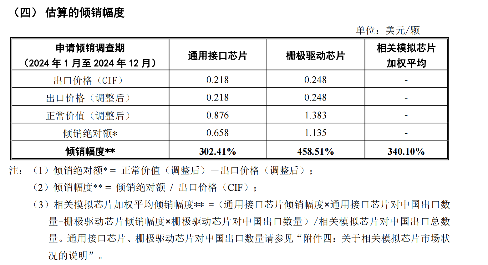 根据江苏省半导体行业协会测算,在2024年1月1日至2024年12月31日的倾销调查期内,美国进口相关模拟芯片的倾销幅度呈现“超高额”特征。其中,通用接口芯片倾销幅度达302.41%,栅极驱动芯片倾销幅度更高至458.51%,远超正常贸易范畴,构成典型的恶意倾销行为。