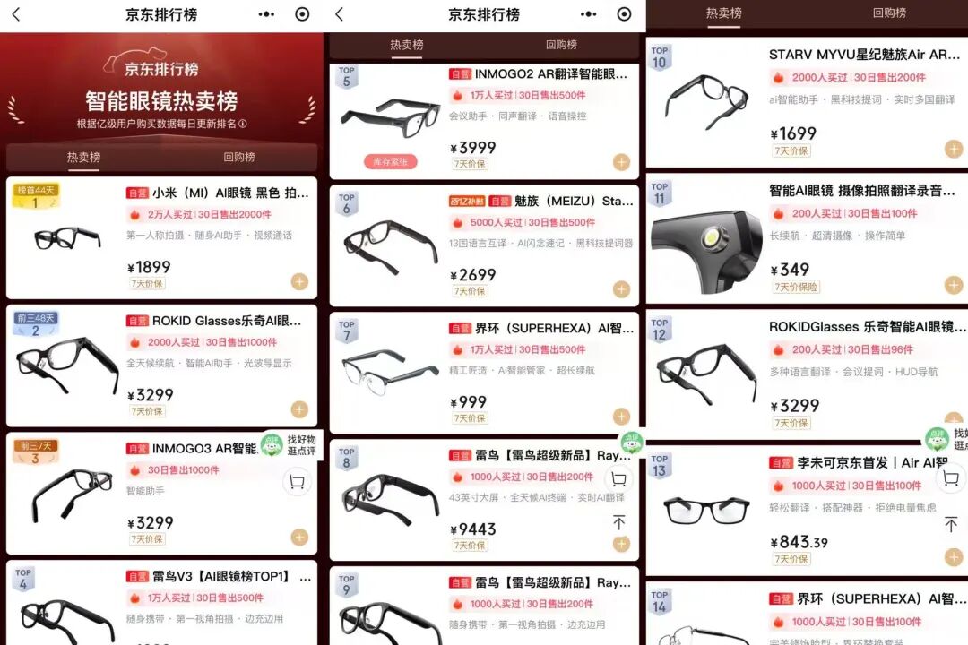 记者在京东的智能眼镜热卖榜上看到,排名前五的分别为小米、ROKID、影目科技IMMOGO3、雷鸟、影目科技IMMOGO2。其中小米AI眼镜显示30日售出2000件,影目INMO多款眼镜合计销量超过1500件,ROKID多款眼镜销量超过1000件。