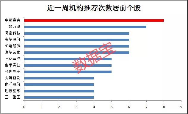 从个股来看,9只股票获机构推荐次数超过4次,其中中新赛克、歌力思、海尔智家、沪电股份、韦尔股份、闻泰科技6股获买入推荐次数居前。