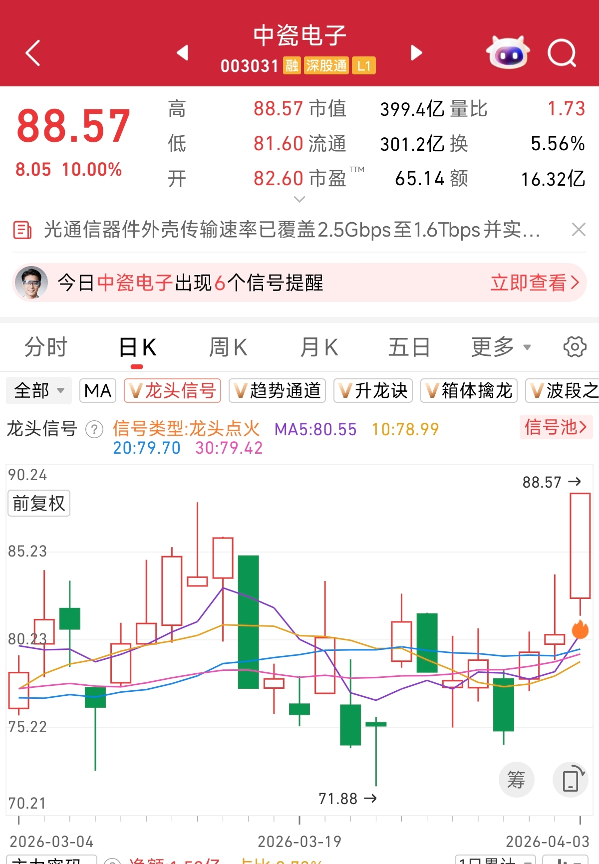 根据龙头信号监控,近日大涨的中瓷电子,在4月3日出现龙头冲刺信号,感兴趣的朋友可以自行跟踪判断。