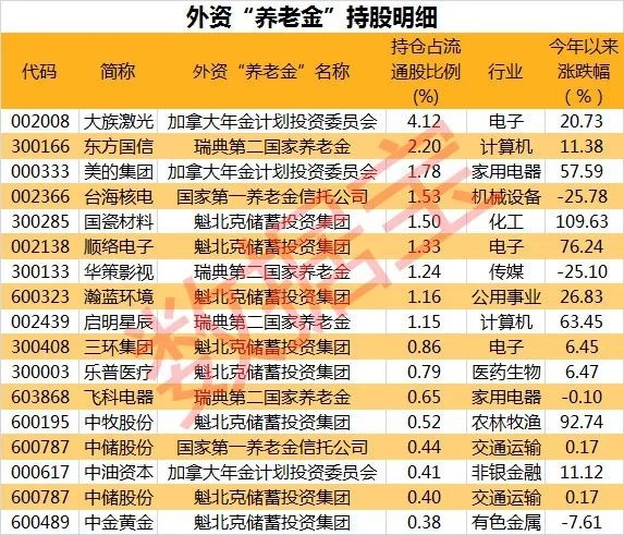 截至三季度末,证券时报·数据宝梳理A股最新的股东明细发现,目前在A股持仓比例较大的国外“养老金”有国家第一养老金信托公司、瑞典第二国家养老金、魁北克储蓄投资集团、加拿大年金计划投资委员会,分别持有2家、4家、8家、3家公司的股票,这些“养老基金”是澳大利亚、瑞典和加拿大管理规模较大,比较有影响力的投资管理机构。
