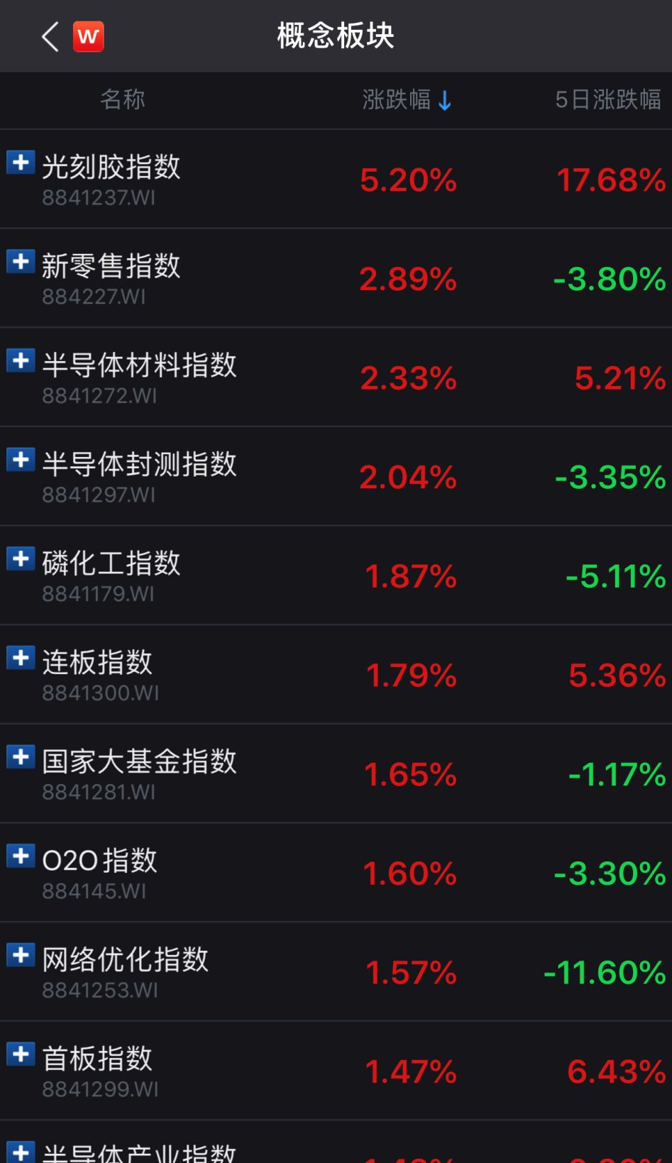 概念板块方面,光刻胶、新零售、半导体等板块表现亮眼。