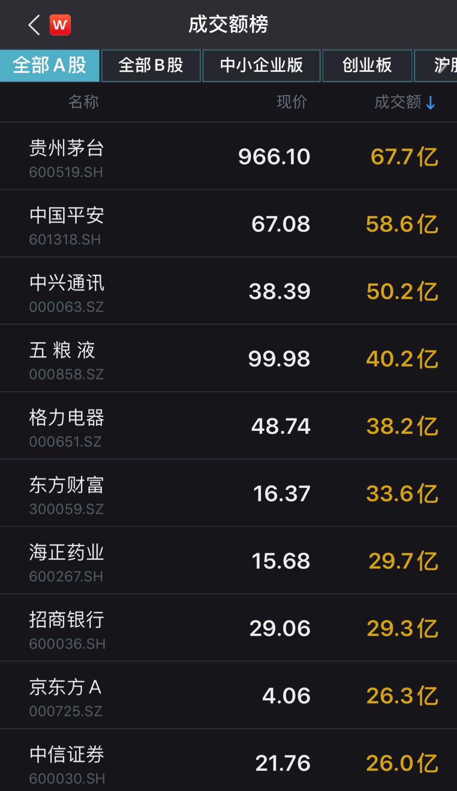 成交额方面,贵州茅台、中国平安、中兴通讯、五粮液、格力电器等蓝筹股居前。