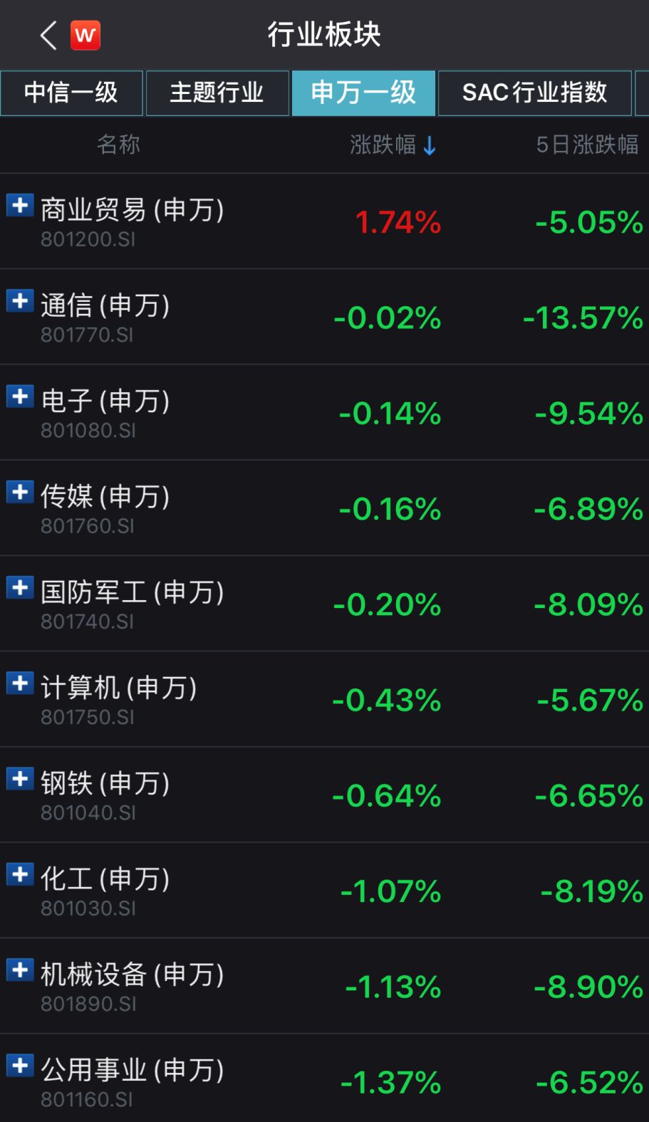 行业板块方面,商业贸易板块表现强势。家用电器、食品饮料、休闲服务、房地产、银行、汽车、非银金融等板块表现弱势。