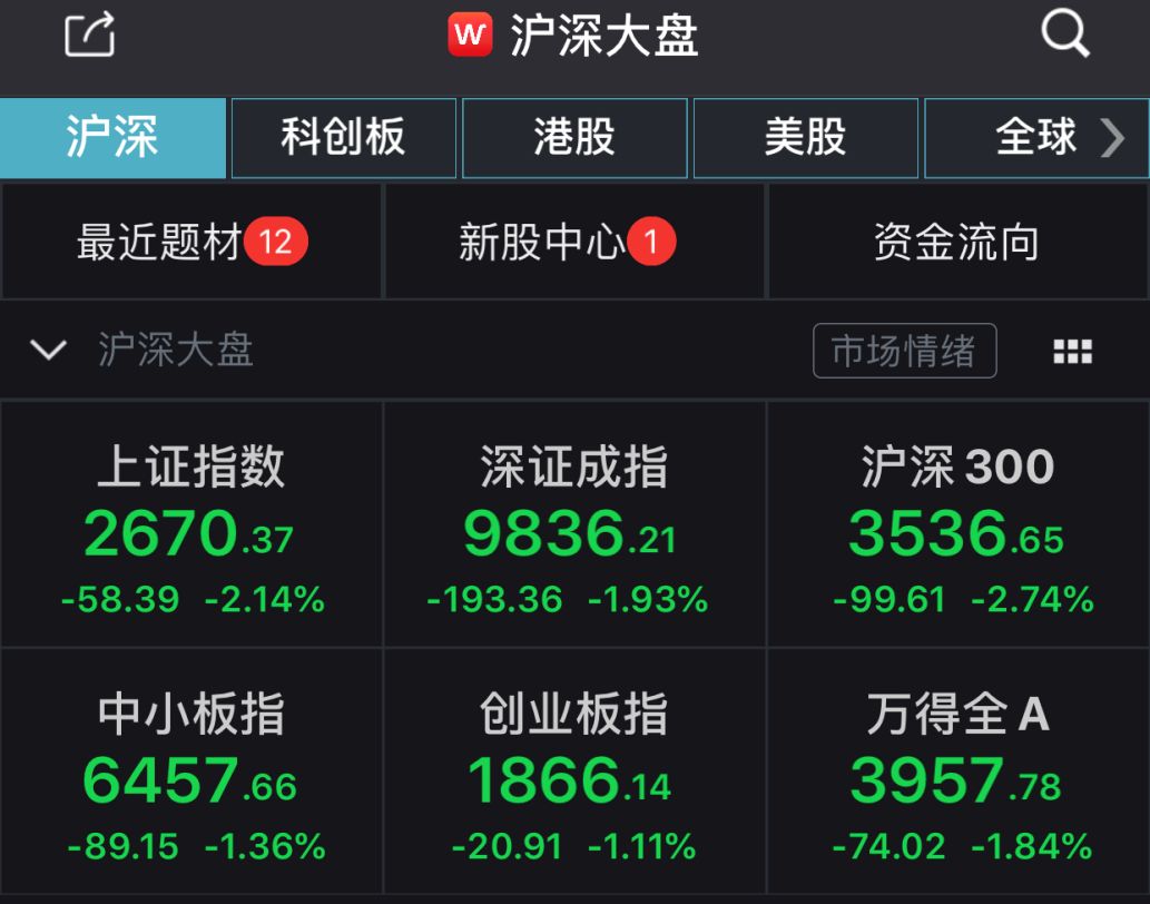 截至上午收盘,沪指下跌2.14%,报2670.37点,成交额1987亿元;深成指下跌1.93%,报9836.21点,成交额2941亿元,两市合计成交额4928亿元;创业板指下跌1.11%,报1866.14点。