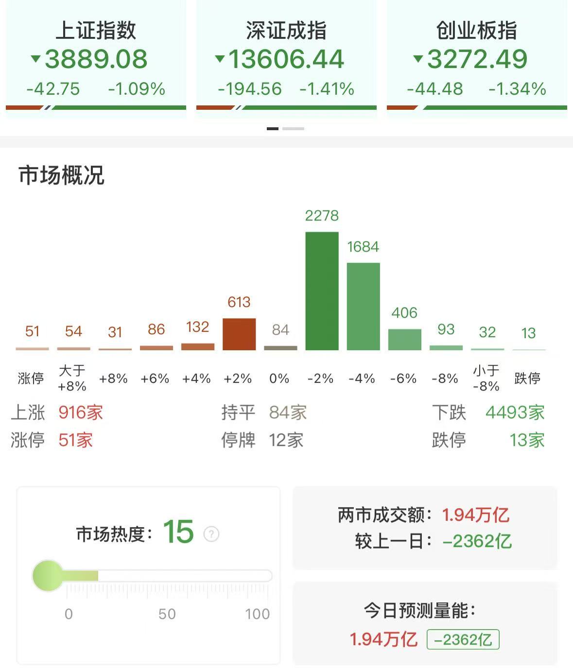 全市场超4400股收绿 两市成交额不足2万亿
