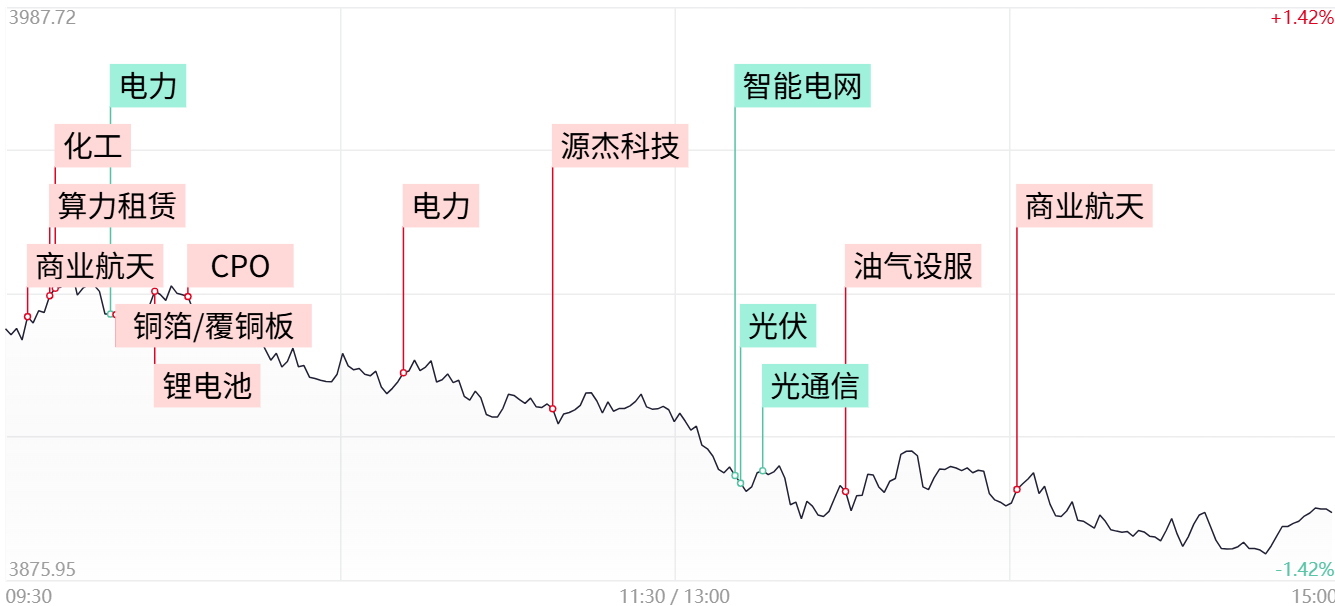 市场震荡调整,三大指数冲高回落跌超1%,科创50指数跌超2%。沪深两市成交额跌破2万亿,较上一个交易日缩量2362亿。盘面上,市场热点弱势轮动,全市场超4400只个股下跌。从板块来看,电力板块表现活跃,华电能源6天4板,湖南发展3连板,晋控电力、广西能源、深南电A涨停。锂电材料股反复走强,融捷股份3连板,石大胜华、大东南涨停。商业航天概念局部拉升,神剑股份、中超控股、西部材料、再升科技涨停。下跌方面,电网设备概念走弱,顺钠股份跌停,亿能电力、东方电缆、灿能电力大跌。光纤概念震荡下挫,法尔胜跌停。截至收盘,沪指跌1.09%,深成指跌1.41%,创业板指跌1.34%。