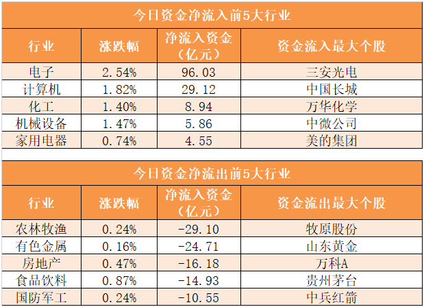 28个申万一级行业中,13个行业实现资金净流入,其中电子行业净流入96.03亿元居首。