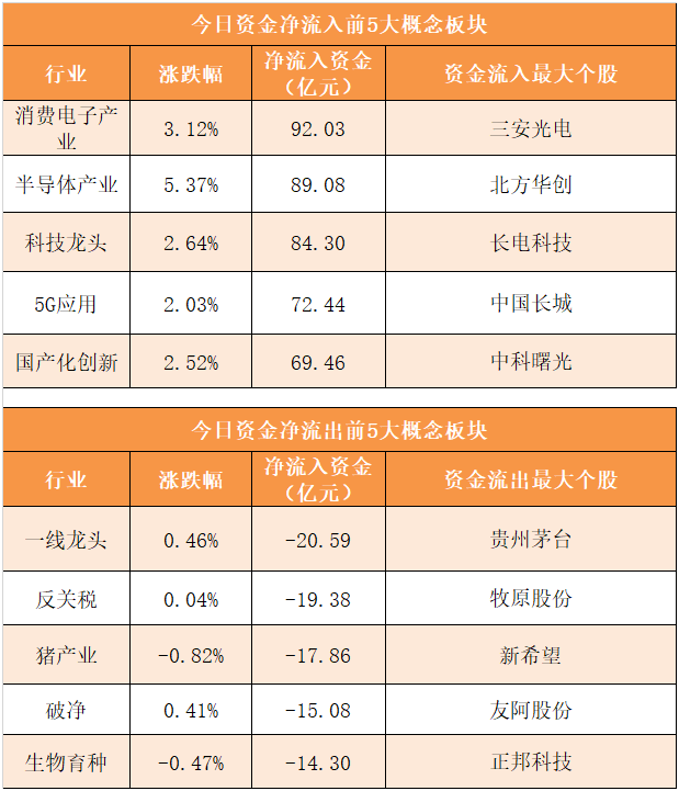 概念板块方面,今日消费电子产业、半导体产业、科技龙头、5G应用等概念板块资金呈现净流入,其中消费电子产业概念净流入92.03亿元居首。