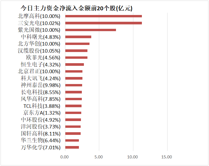今日沪深两市主力资金开盘净流出22.84亿元,尾盘净流入27.93亿元,两市全天资金净流出0.32亿元。