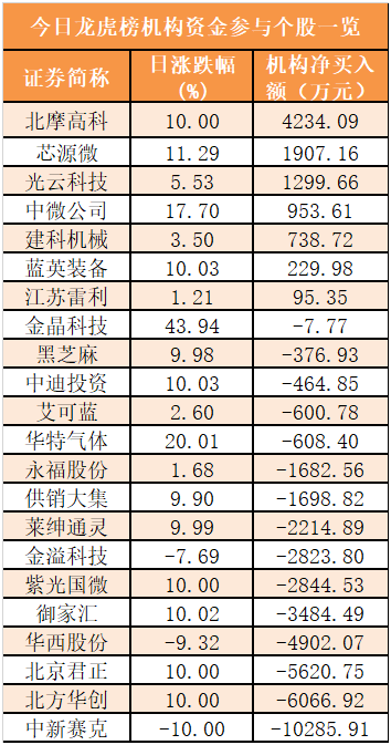 盘后龙虎榜数据显示,机构现身22股,其中北摩高科等7股呈现机构资金净买入,中新赛克等15股呈现机构资金净卖出。