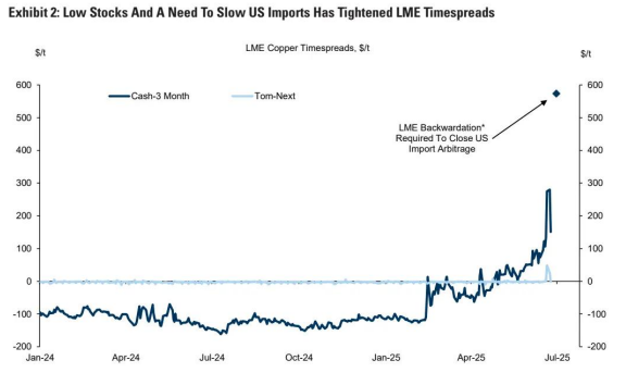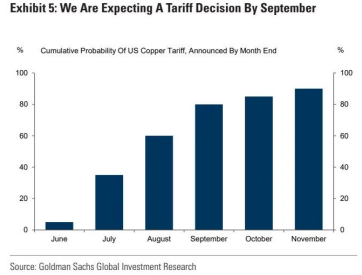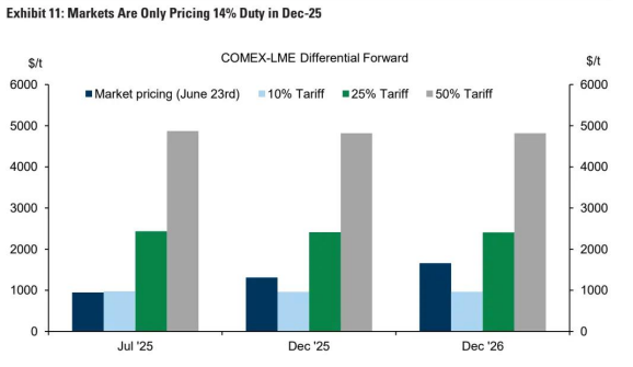 高盛重申铜关税交易,即做多 2025 年 12 月 COMEX-LME 铜套利,因为高盛认为当前市场隐含的 14% 关税明显低估了 25% 或 50% 关税的可能性。