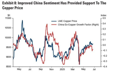 高盛的价格上调反映了第三季度价格开始高于预期,原因是(1)全球库存出现重大脱节,美国过度进口超过高盛的初步预期,以及(2)中国市场情绪和活动目前保持相对韧性。反映中国股市和中国短期及长期利率(是中国市场情绪的良好指标)的中国(不含铜)增长因子近几个月稳步上升(图表 8)。尽管活动数据喜忧参半,但第二季度实际 GDP 同比增长略高于 5%,零售销售(包括家电)保持韧性,高盛的中国当前活动指标(CAI)经季节性调整后环比年率仍超过 4%(尽管在放缓)。