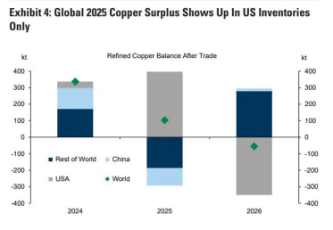 图表 4:2025 年全球铜过剩仅出现在美国库存中