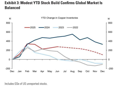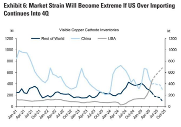 高盛强调,尽管中国和世界其他地区的铜库存较低,但全球铜市场仍处于适度过剩状态。一旦计入美国未报告的库存,2025 年上半年全球库存增加了约 28 万吨(图表 3),高盛预计到年底将出现 10.5 万吨的小幅过剩(图表 4)。然而,对价格重要的是,这种全球过剩仅在美国显现,高盛预计 2025 年美国精炼铜过剩(贸易后)约 40 万吨,而中国和世界其他地区的区域赤字分别约为 10 万吨和 20 万吨。
