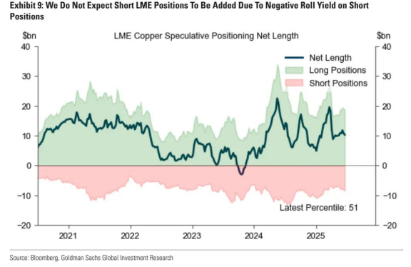 除了 2025 年下半年铜价起点较高外,伦敦金属交易所时间价差的扩大也使得难以增加短期投机头寸。目前,空头伦敦金属交易所头寸的 3 个月负展期收益约为 100-300 美元 / 吨,鉴于高盛现在看到由于美国以外地区的市场赤字(尽管全球略有过剩),价格支撑在 9,000 美元 / 吨左右,这限制了风险回报。
