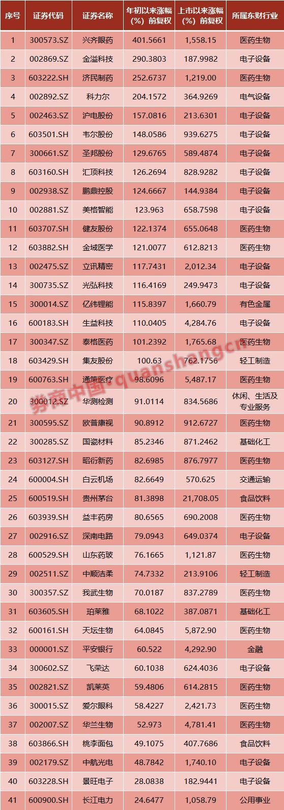 上述最近一周创新高的股票中,兴齐眼药、金溢科技、济民制药、科力尔、沪电股份、韦尔股份等18只股票年初以来的涨幅超过100%,涨幅排名第一的兴齐眼药年初至今已上涨402%,涨幅排名榜单末位的长江电力今年也已上涨25%。分行业看,上述41只个股中,电子行业和医药生物行业占比最高,分别都有15只股票。