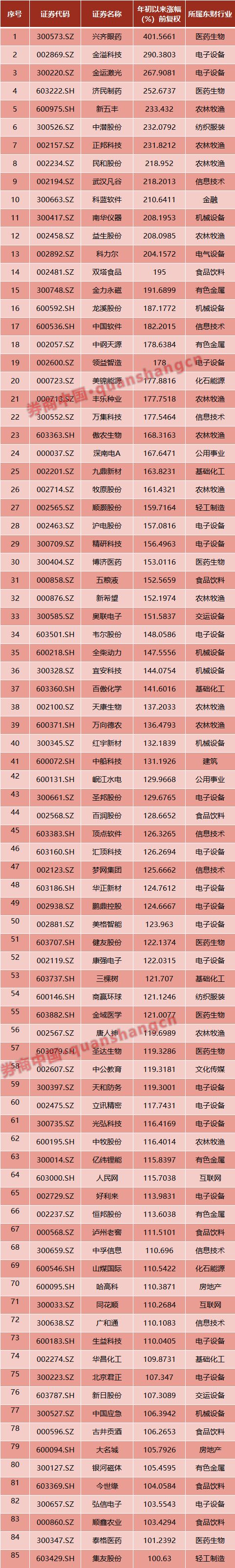 如果仅看涨跌幅情况,同样剔除年内上市的新股,A股共有85只股票年内股价至少翻倍。兴齐眼药、金溢科技、金运激光、济民制药、新五丰排名前列。分行业看,电子设备和农林牧渔行业入围个股最多,名单中分别占据20只和11只。