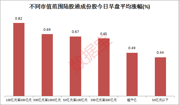 从陆股通成份股来看,中盘股今日早盘涨幅明显高于大盘股。按照市值分类,超千亿成份股平均涨幅不到0.5%,而市值在100亿元至300亿元成份股平均涨幅最高,达到0.82%,另外,市值在300亿元至500亿元成份股,今日早盘也有较好表现,平均上涨0.69%。