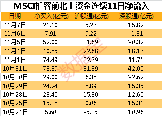 作为年内最大一次扩容,据多家机构测算,扩容为A股市场带来的增量资金将超400亿。事实上,对于本次扩容,外资早已提前布局。证券时报·数据宝统计显示,截至11月7日,北上资金已连续11日呈净流入状态,净流入金额高达372.86亿元。从沪股通和深股通各自的净流入情况来看,深股通净流入情况要略优于沪股通,沪股通合计净流入213.55亿元,沪股通净流入不足160亿元。