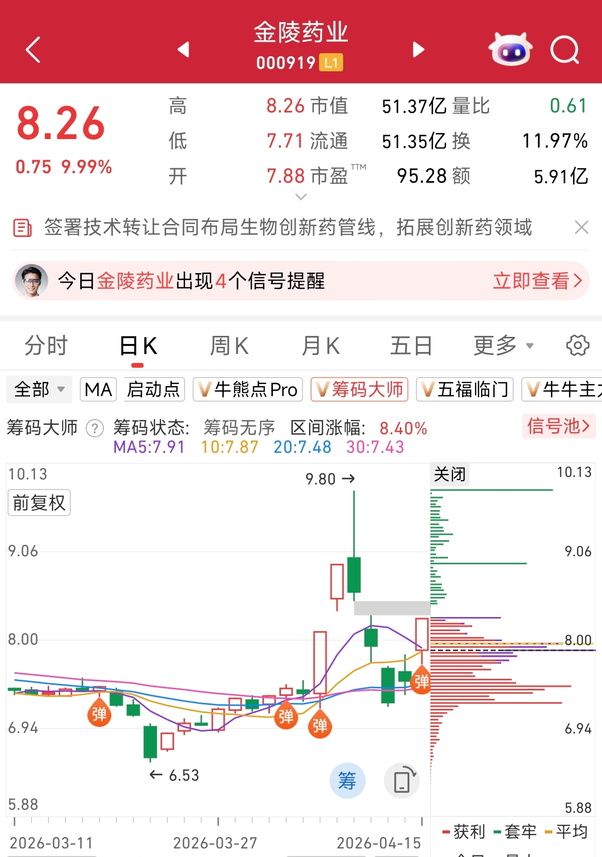 根据筹码大师监控,今日大涨的金陵药业,在4月15日出现筹码强支撑信号,感兴趣的朋友可以自行跟踪判断。