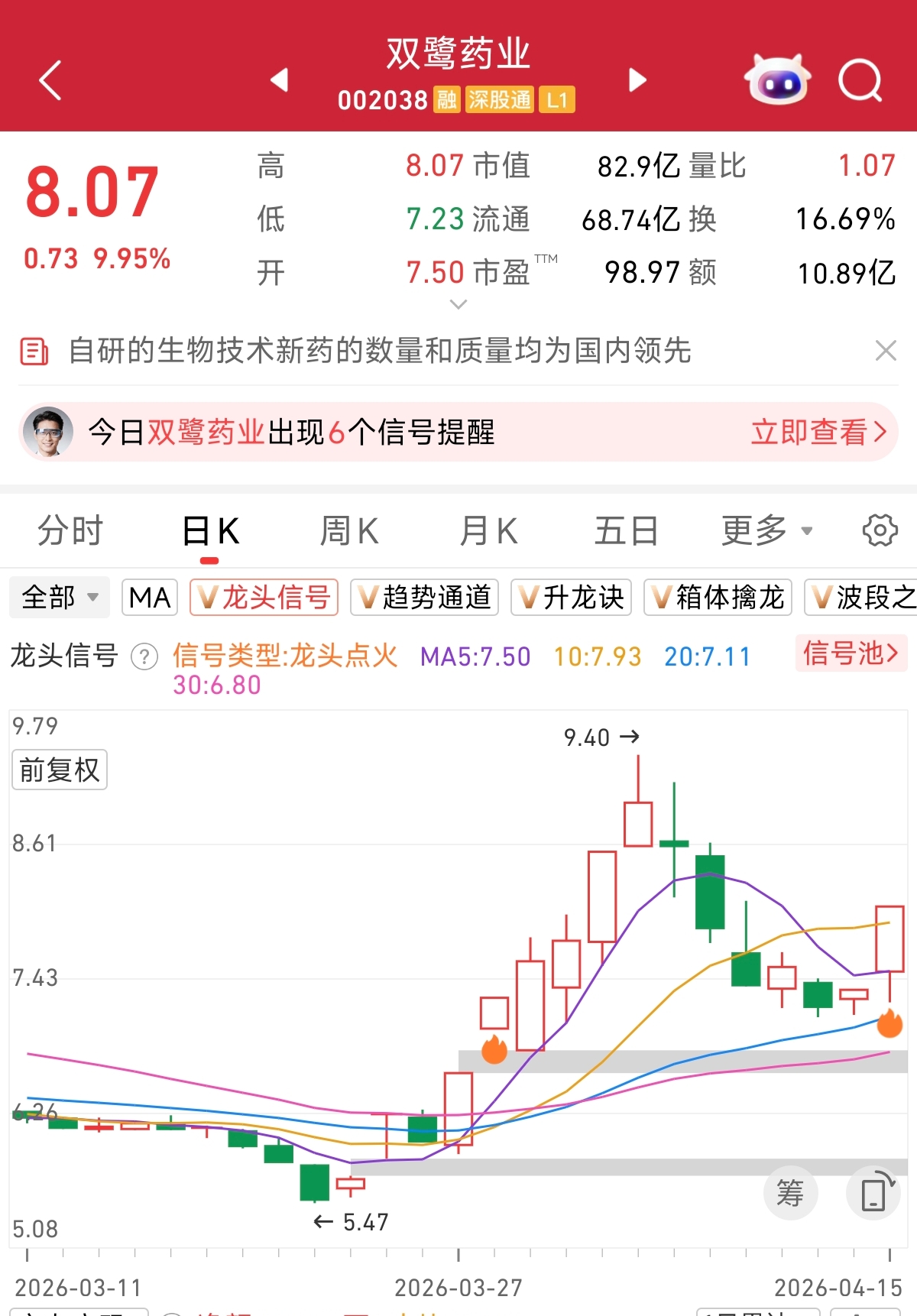 根据龙头信号监控,近日大涨的双鹭药业,在4月15日出现龙头点火信号,感兴趣的朋友可以自行跟踪判断。