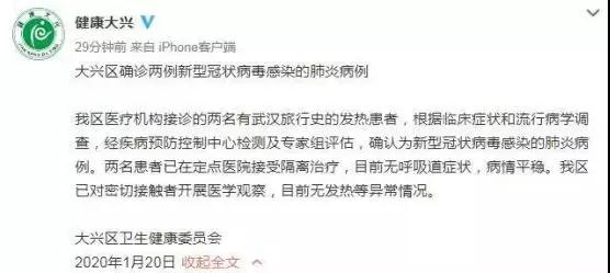 据北京市大兴区卫健委官方微博称,北京市大兴区医疗机构接诊的两名有武汉旅行史的发热患者,根据临床症状和流行病学调查,经疾病预防控制中心检测及专家组评估,确认为新型冠状病毒感染的肺炎病例。