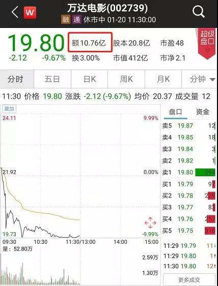 其中,400亿市值的龙头股万达电影跌幅深重,开盘后,万达电影跌幅不断加深,盘中逼近跌停。短短半日,就有超10亿资金出逃。截至午盘收盘,万达电影报收19.80元,跌幅9.67%。