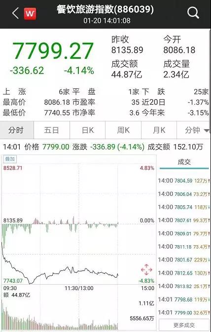 1月20日开盘,餐饮旅游指数开盘大跌,指数一度跌超4%。截至下午两点左右,餐饮旅游指数大跌超4.14%。总市值高达3600多亿的餐饮旅游板块目前已经蒸发了仅150亿元。